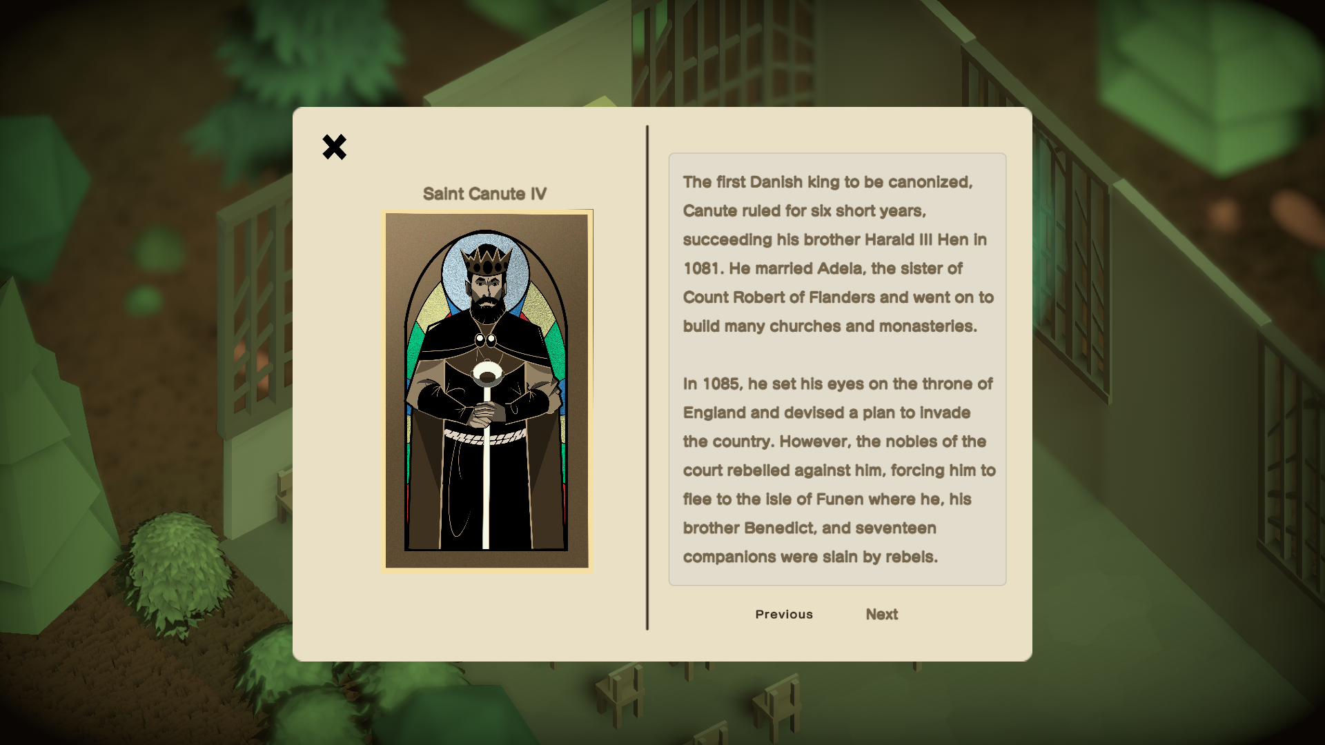 Presentation-wise, Sainthood is an intentionally simple-looking game. Its 2D character art consists mostly of cartoon character sketches, and the 3D environments are polygonal and somewhat impressionist. The color choices for the game in particular stand out as very soft and sepia-toned, giving the game a sort of hazy, nostalgic feel. All things considered it’s not my first choice of art style, but considering the cozy feeling the game is trying to cater to I can’t say this less stimulating approach isn’t appropriate for the overall vision. The music featured in the game largely consists of classical music and chants played softly over the activities at hand. It’s very much the sort of thing you’d add to a playlist for rest and prayer, and I think it does its job admirably even if it wasn’t a highlight of the experience.